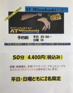 三橋接骨院時間外部門です。いままで多くの方にご利用いただいていましたが、今回メニューを一新しました。